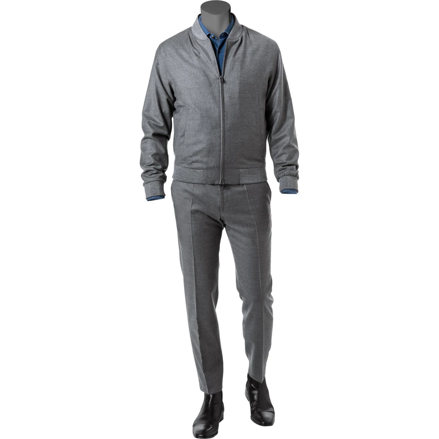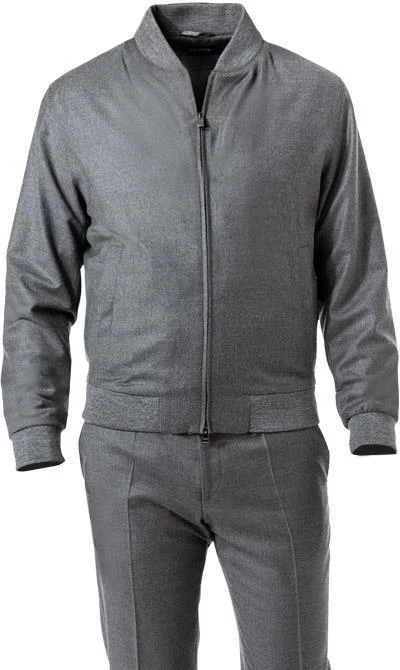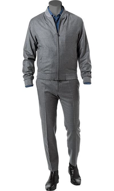 Mit dieser außergewöhnlichen Anzugvariante ziehen Sie die Blicke auf sich! Eine neue Interpretation des Anzugs ist die Kombination aus Blouson und Jogpants. Der zeitgemäße Zweiteiler ist aus Schurwolle in Flanellqualität gefertigt, die nicht nur für optimalen Tragekomfort sorgt sondern auch einen ausdrucksstarken Look inszeniert. Feine Rippenstrickdetails an Stehkragen und Bündchen und eine Jogpant als modische Alternative zur klassischen Anzughose unterstreichen die innovative Optik.
