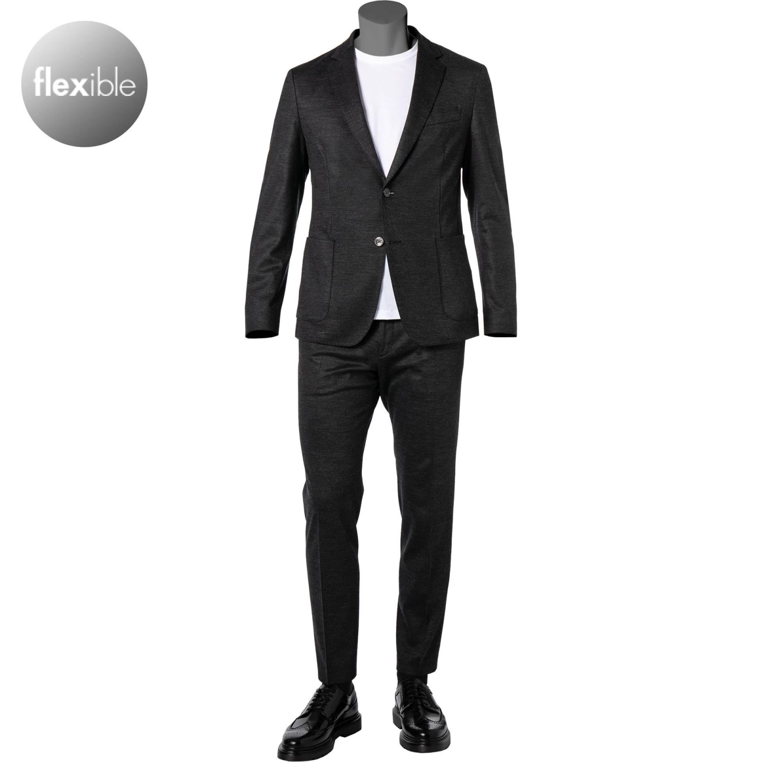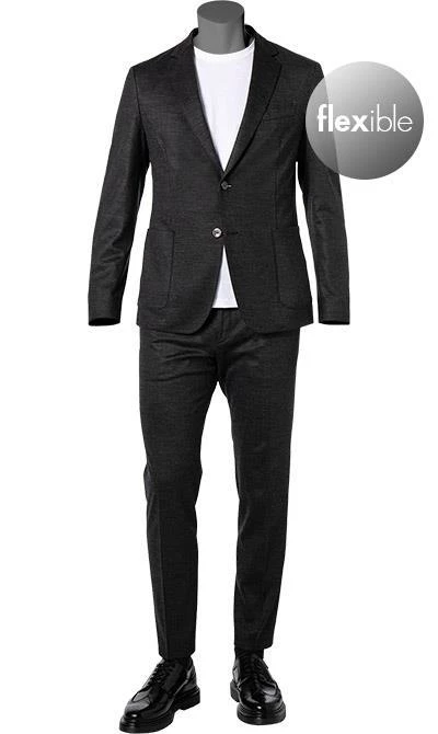 Eine elastische Jersey-Qualität in melierter Optik kombiniert mit einer schmalen Passform, macht diesen Zweiteiler zu einem stilvollen Begleiter mit viel Tragekomfort. Ein komfortabler Hosenbund mit einem Elastikeinsatz und mit Kordelzug erinnert an eine trendige Jogpants und verleiht diesem eleganten Anzug einen sportiven Charakter.