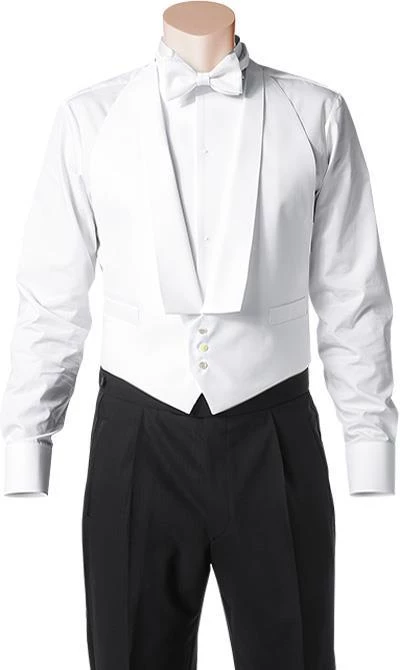 Ist die Kleiderordnung festlich dürfen Weste und Schleife dabei nicht fehlen. Die Weste ist aus feinem Piquégewebe das durch seine dezente Struktur hervorragend Frackhemden in glatter Popeline ergänzt.