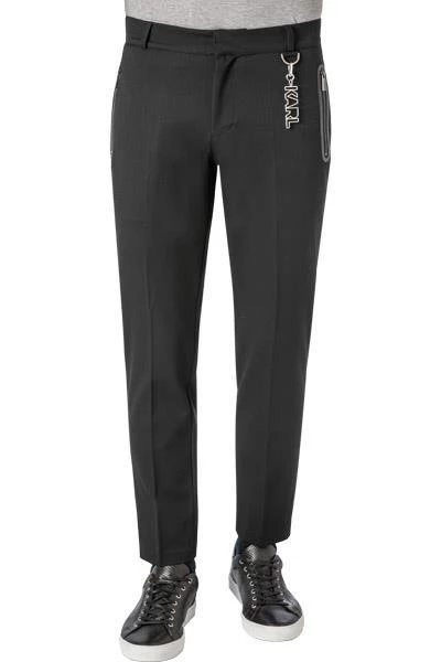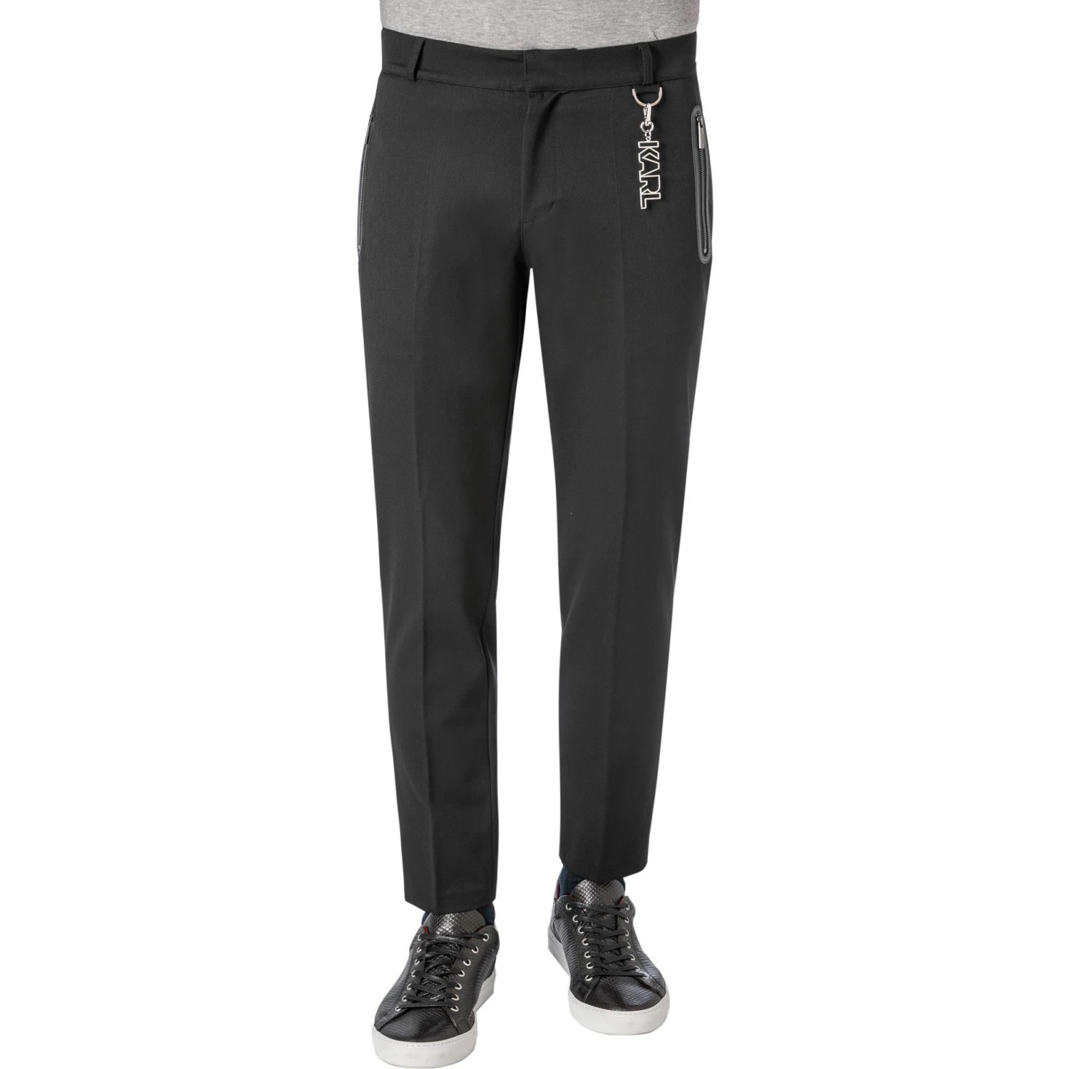 Ein modernes Design und ein klassischer Schnitt machen diese hochwertige Hose aus. Sie lässt sich vielseitig kombinieren und garantiert durch die pflegeleichte und kompakte Twill Qualität besten Tragekomfort. Zwei mit Lederstreifen verzierte Reißverschlusstaschen mit Logo-Zipper, sowie ein abnehmbarer KARL-Anhänger komplettieren das exklusive Gesamtbild.