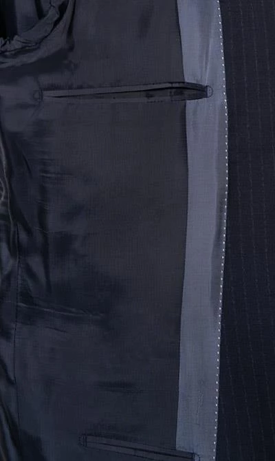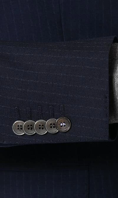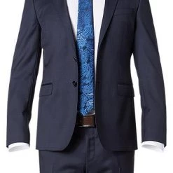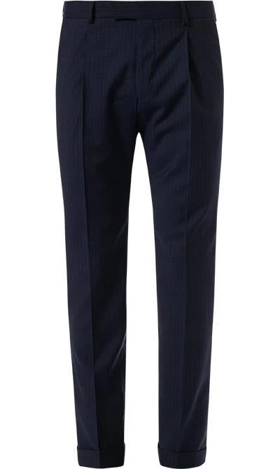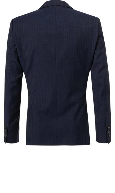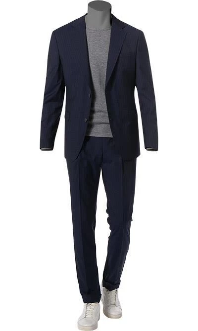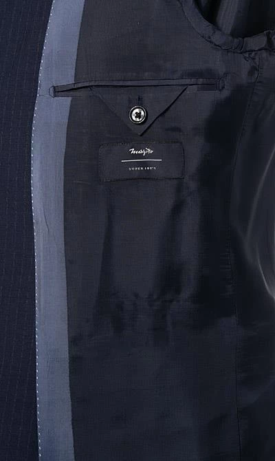 Ein Kontraststreifen am Futtereinsatz und hochwertige Ziernähte in Handstich-Optik sowie eine feine Schurwoll-Qualität machen diesen Anzug zu etwas Besonderem.