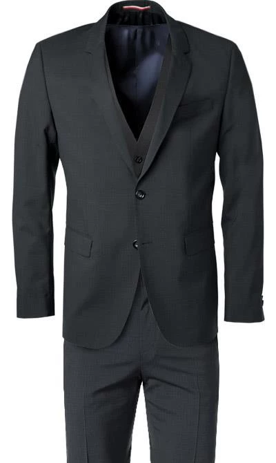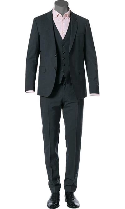 Stilvoll hoch drei ist dieser Anzug mit Weste. Die hochwertige Schurwoll-Qualität mit geringem Stretch-Anteil sorgt für angenehmen Tragekomfort und Bewegungsfreiheit. Die körperbetonte Passform unterstreicht die maskuline Silhouette. Das Sakko-Futter und der Rücken der Weste im Logo-Dessin setzen einen effektvollen Akzent.