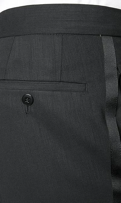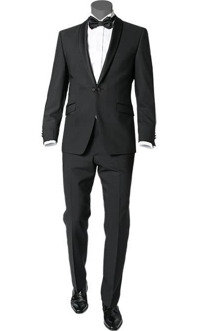 Ein luxuriöser Smoking – klassisch, aber dennoch außergewöhnlich. Modisch schmal geschnitten, mit Einknopf-Sakko, Schalkragen und dem klassischen Galon auf den Seitennähten der Hose. Material ist ein besonders leichtes, feines Schurwolltuch mit dezentem Webstreifen.